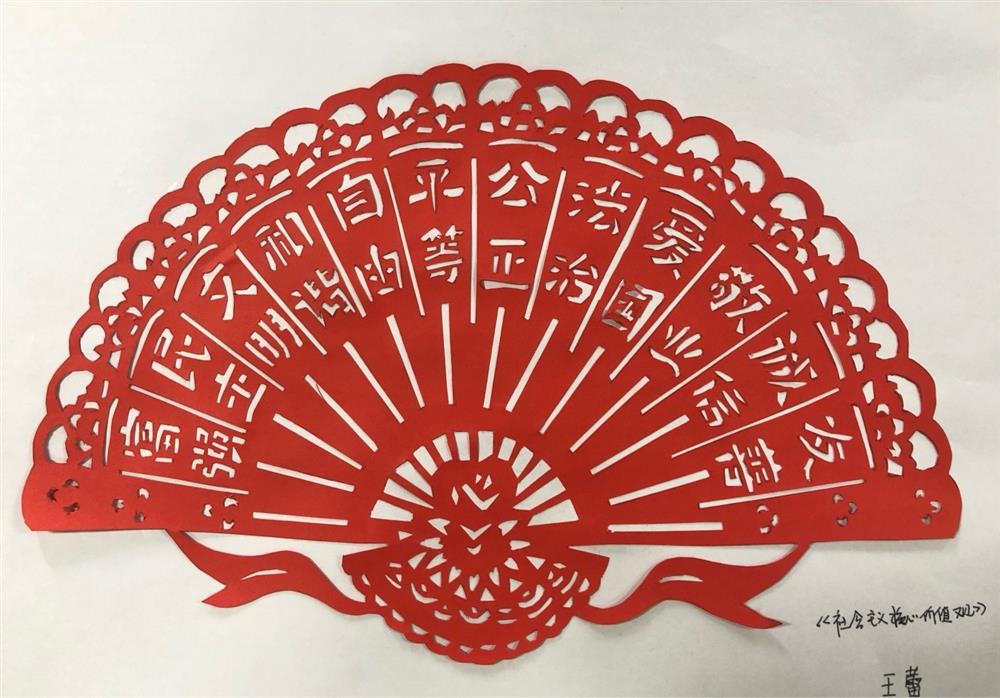園區投資公司王蕾的作品《社會(huì )主義核心價(jià)值觀(guān)》獲得二等獎,作者以緊密有致的扇形設計將社會(huì )主義核心價(jià)值觀(guān)這個(gè)主題巧妙的呈現,作品畫(huà)面均衡、線(xiàn)條流暢,美觀(guān)大方,有較高的藝術(shù)性和觀(guān)賞性。