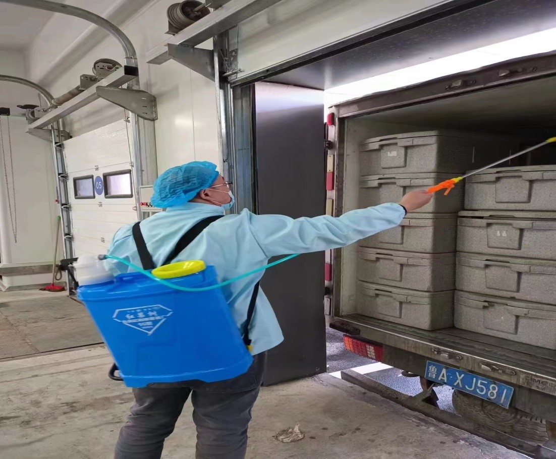 為保證食品安全和員工自身安全,金德利團餐公司、供應鏈公司每天都堅持消毒環(huán)節的打卡監督管理。進(jìn)入公司園區的車(chē)輛嚴格進(jìn)行消殺,大噴霧器對進(jìn)出車(chē)輛進(jìn)行消殺、登記;對接車(chē)間具體負責人安排專(zhuān)人對食品箱進(jìn)行消殺。
