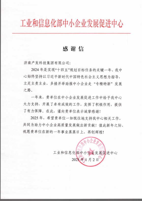 近日,濟南產(chǎn)發(fā)科技集團有限公司(以下簡(jiǎn)稱(chēng)“科技集團”)收到一封來(lái)自工業(yè)和信息化部中小企業(yè)發(fā)展促進(jìn)中心(以下簡(jiǎn)稱(chēng)“促進(jìn)中心”)的感謝信,信中對科技集團在2024年中小企業(yè)發(fā)展促進(jìn)工作中發(fā)揮積極作用、提供有力保障表示由衷感謝。