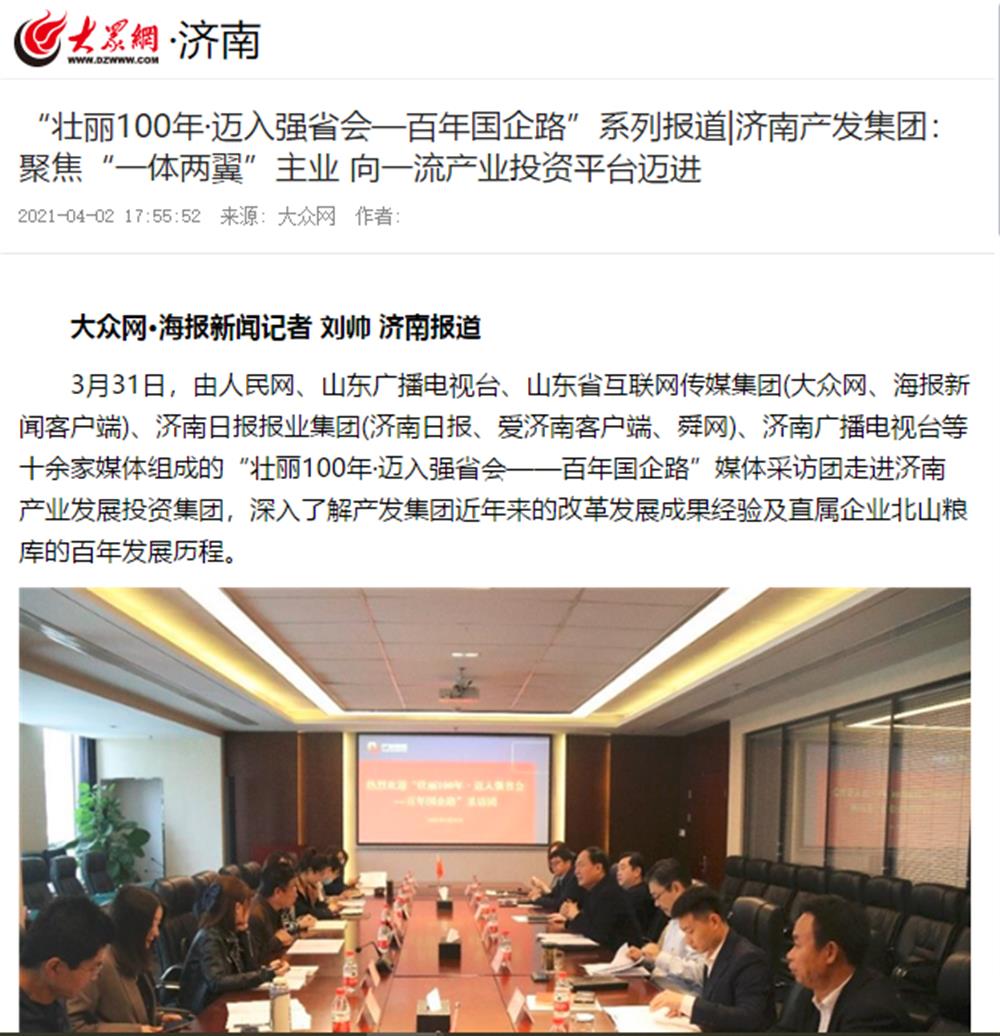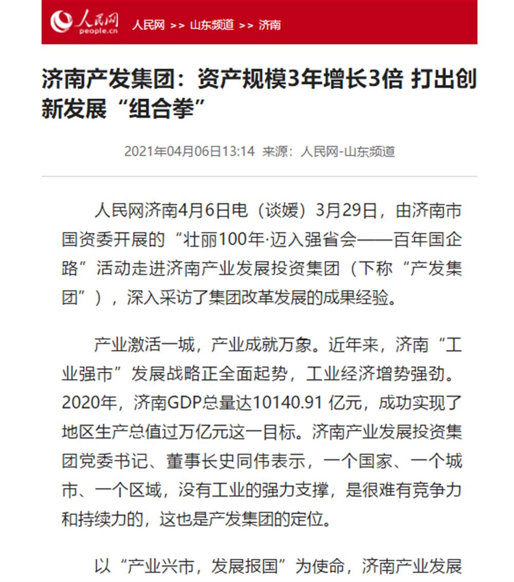 近日,市國資委舉辦的“壯麗100年·邁入強省會(huì )——百年國企路”媒體團一行到訪(fǎng)濟南產(chǎn)發(fā)集團后,人民網(wǎng)、大眾網(wǎng)、閃電新聞、濟南電視臺、濟南日報、帶濟南等多家國家、省市級媒體聚焦報道了集團改革發(fā)展的成果經(jīng)驗。
