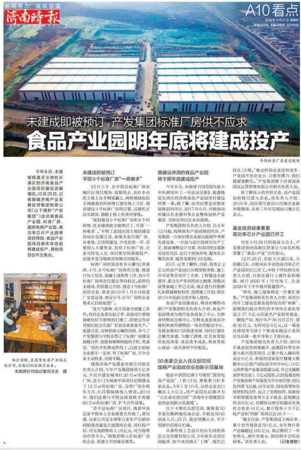 今年8月,本報曾刊發(fā)《國內最大中央廚房開(kāi)工一年還沒(méi)見(jiàn)影》,報道地處長(cháng)清區的濟南食品產(chǎn)業(yè)園項目建設停滯一事。12月25日,記者跟隨濟南產(chǎn)業(yè)發(fā)展投資集團有限公司(以下簡(jiǎn)稱(chēng)“產(chǎn)發(fā)集團”)走訪(fǎng)其食品產(chǎn)業(yè)園、標準廠(chǎng)房、國貿電商產(chǎn)業(yè)園、高功率芯片產(chǎn)業(yè)園等項目,得知食品產(chǎn)業(yè)園項目明年年底前將建成投產(chǎn),其他項目也不乏亮點(diǎn)。