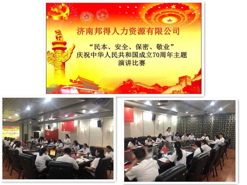 9月29日下午,濟南邦得人力資源有限公司“民本、安全、保密、敬業(yè)—慶祝中華人民共和國成立70周年”主題演講比賽活動(dòng)在濟南人才市場(chǎng)六樓會(huì )議室熱烈舉行,邦得公司全體員工牢記公司發(fā)展使命,用自己的成長(cháng)感悟為新中國成立70周年獻“禮”。